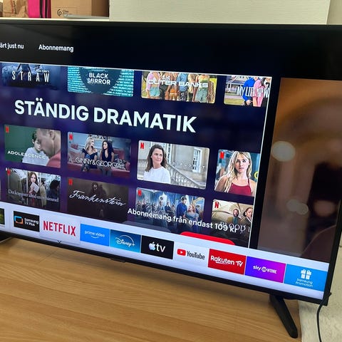 Modellen är en smart-tv med stöd för strömningstjänster via internetanslutning. Tv:n har platt LED-skärm och står på två benfästen. Fjärrkontroll från Samsung ingår enligt bild.