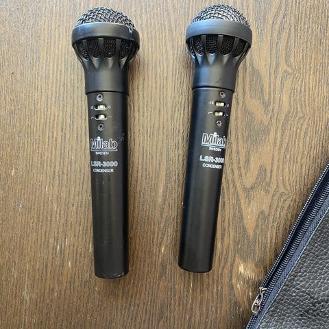 Okay II trådlösa mikrofoner i svart färg. Handhållna mikrofoner med strömbrytare på kroppen. Passar för tal, sång och andra ljudupptagningar där trådlös användning önskas. Märkning och reglage sitter på mikrofonernas hölje för enkel hantering.