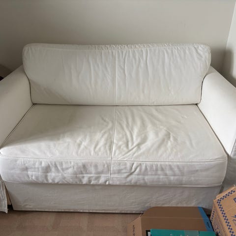 IKEA 2-sits bäddsoffa i vit klädsel. Utdragbar del med träribbor.