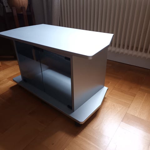 Vitt rullbord med flera hyllplan. Bordet har tre plan i olika höjd samt en mindre bottenhylla. Utrustat med hjul för enkel förflyttning.
