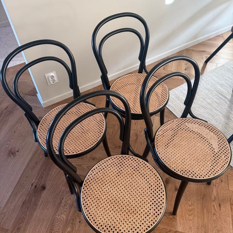 IKEA Aage Petersen stolar i svart färg. Klassisk böjd rygg och runt sitsutförande. Passar som matstolar eller extrastolar i kök, vardagsrum eller andra sällskapsytor. Designade av Aage Petersen för IKEA.