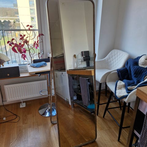 Selling a full length IKEA mirror with a soft green metal frame. The mirror opens and has a bar on the back for hanging clothes, bags, or accessories.