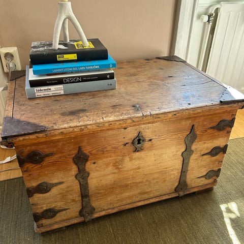 Träskrin med oval form och kraftiga metallbeslag. Skrinet är tillverkat i trä med utanpåliggande metallband, nitar och handtag upptill. Locket är gångjärnsfäst och insidan är i obehandlat trä. Passar som förvaringsskrin eller som inredningsdetalj.