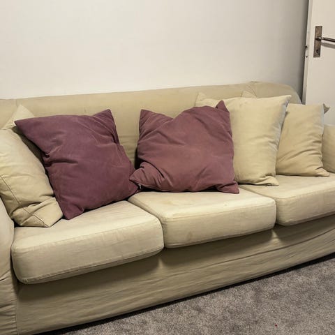 Beige färgad mindre soffa varsamt använd men har samlat på sig lite damm då den stått på hinken och inte använts så skulle behöva borstas av/tvättas.