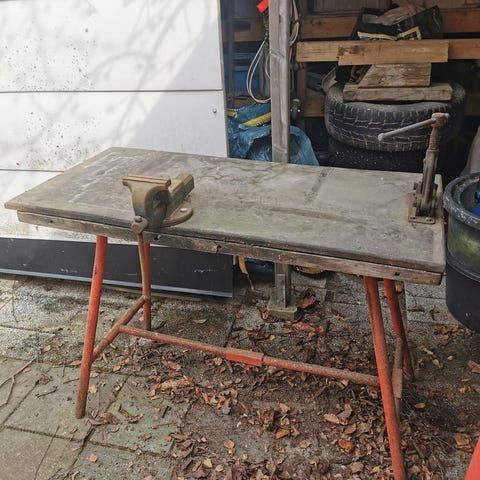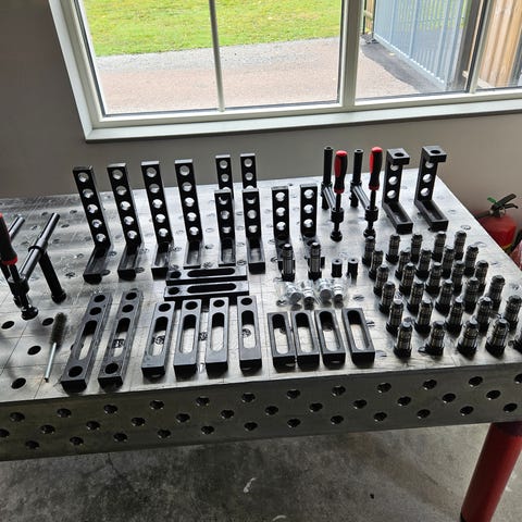 Svetsbord med 6mm stål skiva spännhålen är 16mm och hål bilden 100mm, i ytter raden 50 mm. Ring mig om du har några frågor 0703995968. Spänntvingar är lätt att göra själv av tex. Biltema tvingar.