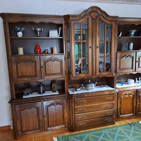 Skåp i brun trä med 2 dörrar och dekorativa utskärningar på fronten. Invändigt finns hyllplan och utdragbara lådor för förvaring av porslin, glas eller andra hushållsartiklar. Passar som förvaringsmöbel i vardagsrum, matsal eller kök.