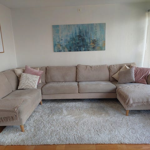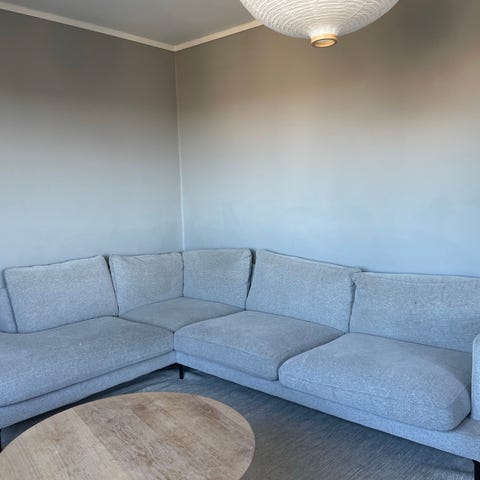 Stor och fin hörnsoffa i grått tyg med ben i ljus ek (extra ben med mörkt trä/mässing följer med).