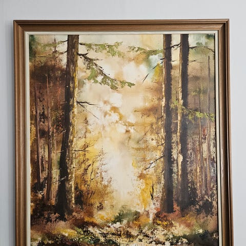 Tavla med lövmotiv i höstfärger mot mörk bakgrund. Rektangulär bild i stående format, inramad med passepartout och guldfärgad ram. Passar som väggdekoration i exempelvis hall, vardagsrum eller kontor.