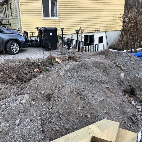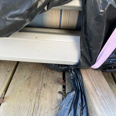 Bortskänker trädäck med sandlåderam och det tillhörande vitt staketet mot nermontering och avhämtning.