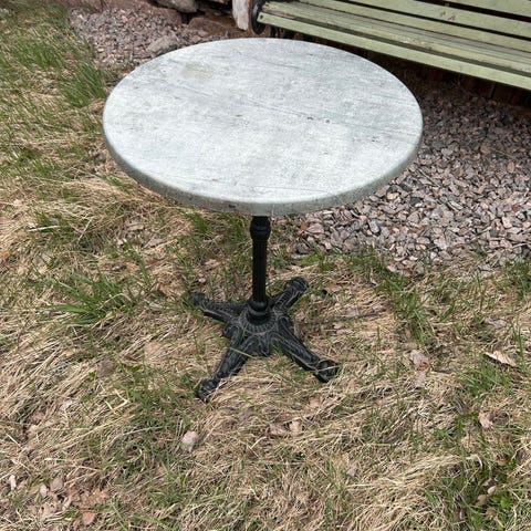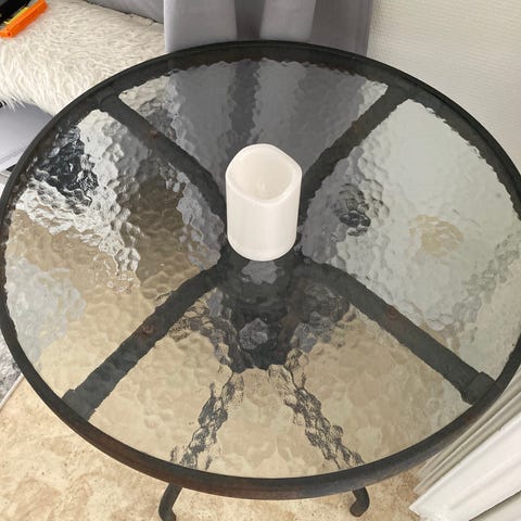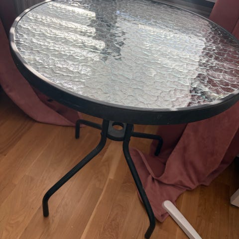 Runt bord med bordsskiva i strukturerat glas och underrede i svart metall. Bordet står på tre ben som möts i en cirkelformad detalj under skivan. Passar exempelvis på balkong, uteplats eller som litet sidobord inomhus.