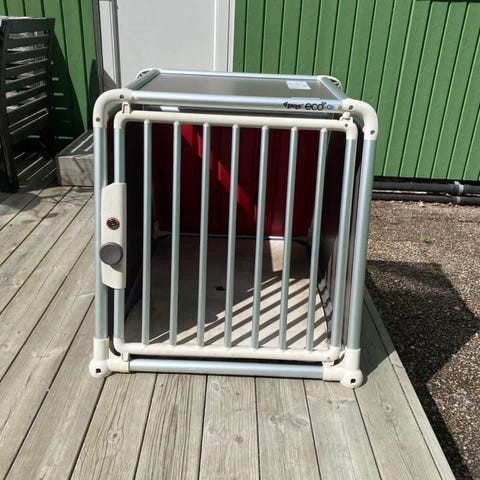 4pets Pro 2 hundbur i storlek L. Stabil bur i grått med metallram och sidopaneler. Avsedd för transport av hund i bil. Märkt med TUV SÜD-testning enligt angiven specifikation på etiketten. Passar för montering i bilens bagageutrymme enligt tillverkarens anvisningar. Normal last enligt etikett är 35 kg. Buren har frontdörr med galler och låsanordning. Fortfarande fint skick, remmar för säker förankring medföljer.
