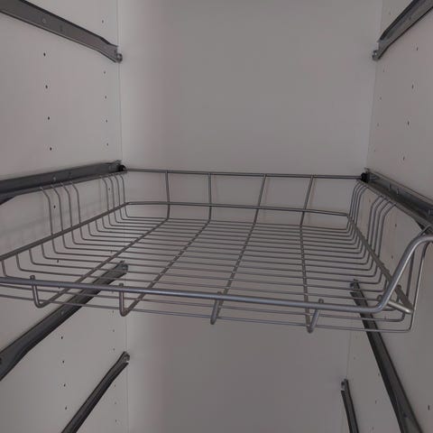 Skruvhål på sidorna och även en del repor inuti skåpet och sågad i bakkant för att passa vid golvlist (se bilder).