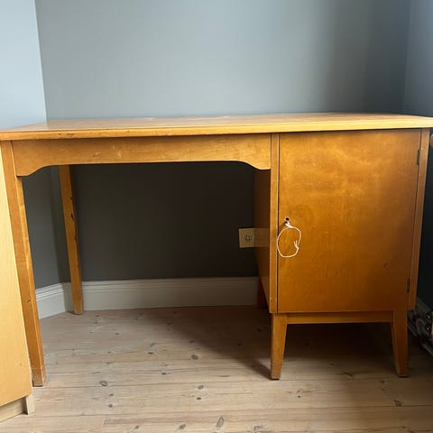 Vitmålat äldre skrivbord. Helt i trä. Mått: 110 ×57 ×77cm.