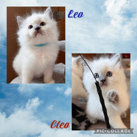 Båda föräldrarna är ragdoll/birma. De har cirka 50% Ragdoll och 50% Helig Birma i sina linjer. Mamman bor här hemma, och pappa finns bilder vid intresse.