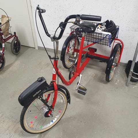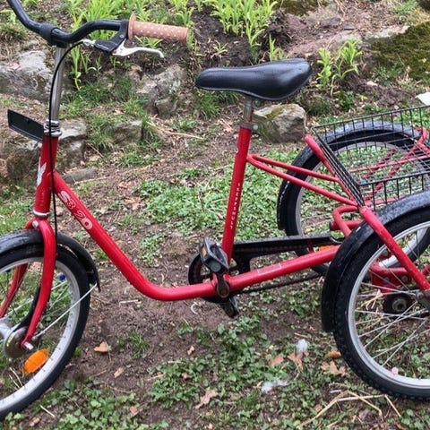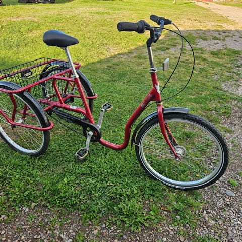Monark lastcykel unisex med ramstorlek XL och 20" hjul. Cykeln har tre hjul med stor främre lastkorg i metall och bakre pakethållare. Röd ram och röd metallkorg framtill. Utrustad med citysadel, skärmar och reflexer. Lämplig för transporter av mindre gods och vardagsärenden.
