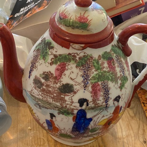 Teservis i persikofärg med motiv av pagoder och japanska landskap. Ofta även kallad för dragonware” eller ”geisha girl porcelain” från mitten av 1900-talet.