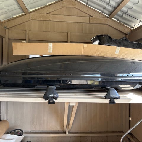 Familjen växer och takboxen har blivit för liten. Boxen är smalare för att man ska kunna få plats med extra utrustning vid sidan av, exempelvis en cykel. Den är i fullängd så längdskidor på 207 cm går in med god marginal. Två-tre par per sida tillsammans med stavar och packning emellan gör den väldigt rymlig för sin storlek. För sommarresor är den mer än tillräcklig. Den höga invändiga höjden gör det möjligt att frakta några golfbagar, skulle tro att minst fyra går in även om vi bara haft två som mest.