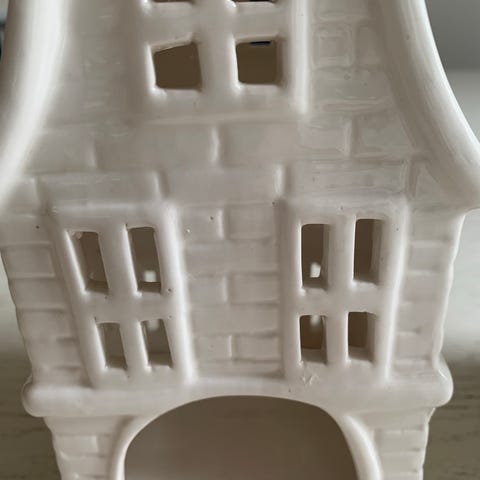 Majas Cottage ljuslykta utformad som ett hus i vit keramik. Ljuslyktan har flera fönsteröppningar som släpper ut ljuset och ett hål på baksidan för att placera värmeljus. Undersidan har små fötter och märkning. Passar som inredningsdetalj på bord, hylla eller fönsterbräda.Höjd: 13 cm, bredd: 8 cm.