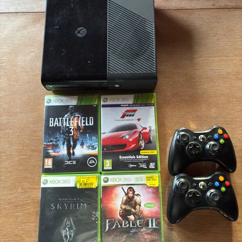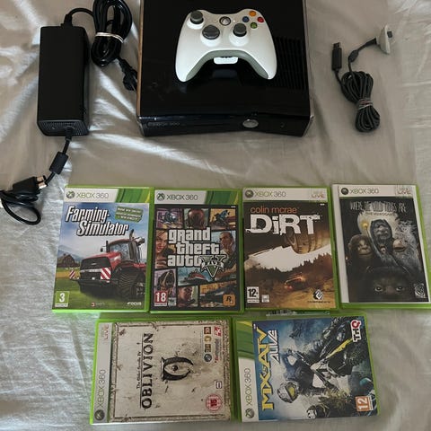 Microsoft Xbox 360 spelkonsol med tillhörande strömadapter och en trådlös handkontroll. I annonsen ingår flera bilspel till Xbox 360, bland annat olika racingspel. Konsolen är avsedd för hemmabruk och ansluts till tv eller bildskärm via HDMI eller annan kompatibel anslutning beroende på modell. Passar för spel av Xbox 360‑titlar och kompatibla spel samt för uppspelning av media som stöds av Xbox 360‑systemet.