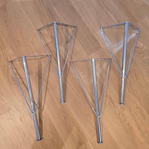 Hay köksställ i metall. Stället är utformat med vågformade fack i metalltråd och står i en rektangulär plåtbricka. Kan användas i kök för organisering eller avrinning av olika köksredskap, tallrikar eller lock. Neutral metallfärg.