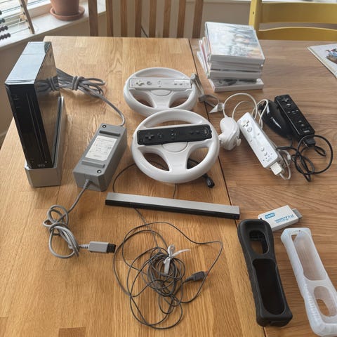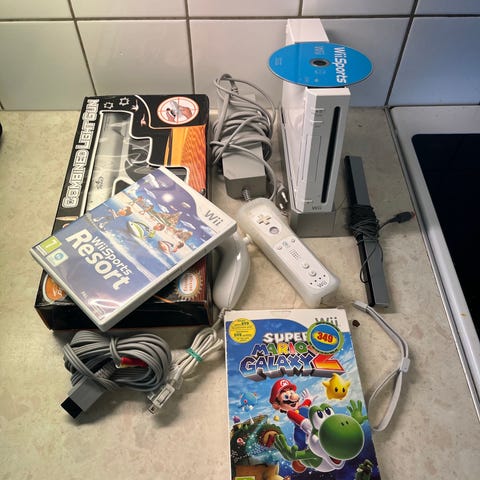 Nintendo Wii spelkonsol med tillhörande kablar och sensorrad. I uppsättningen ingår en Wii-fjärrkontroll med handledsrem samt nunchuk-handkontroll. En Wii Sports-skiva följer med för spel. Konsolen är avsedd för hemmabruk och ansluts till TV via medföljande AV-kabel och strömadapter.