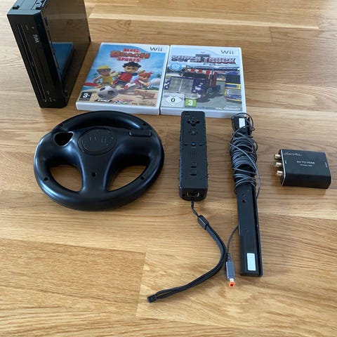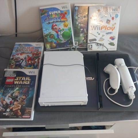 Nintendo Wii spelkonsol med tillbehör och spel. På bilden syns bland annat en vit Wii-konsol med strömadapter, videokabel, sensorbar, Wii Remote-handkontroll och nunchuk. Det följer även med fysiska spel, däribland Wii Sports Resort och Super Mario Galaxy, samt originalkartong till delar av utrustningen. Konsolen är avsedd för hemmabruk och kan användas för rörelsekänsliga spel och familjespel på kompatibel tv eller skärm med rätt anslutningar.