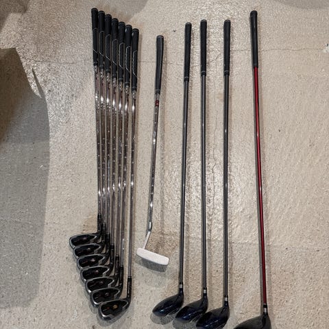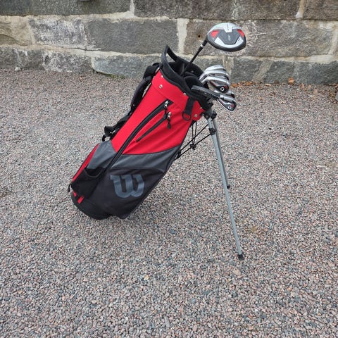 Golfklubbsset för vänsterhänta, dam, med vagn. I väldigt gott skick, sparsamt använt. Märke Voit V5, väldigt bra för nybörjare. Innehåller följande 10 klubbor: S, P, 6, 7, 8, 9, V5 putter series II, V5 Hybrid driver 450cc, V5 Fairway wood 19°, V5 Hybrid iron 27° 5. Kommer med rejäl mängd bollar och pegs.