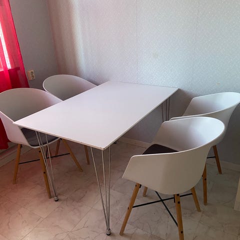 Matbord med en mörkbrun träskiva och vita ben. Bordet är lämpligt för matplats eller kök. Materialen inkluderar trä för skivan och målade träben.