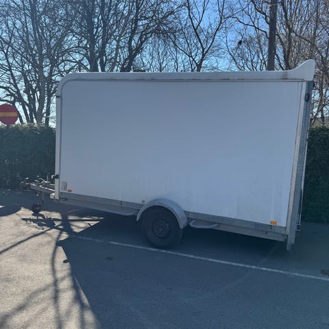 Trailern är påbörjad renovering invändigt, med träpanel på väggar och tak. Bra grund att bygga vidare efter egna behov och idéer. Stabil konstruktion och rymlig insida.