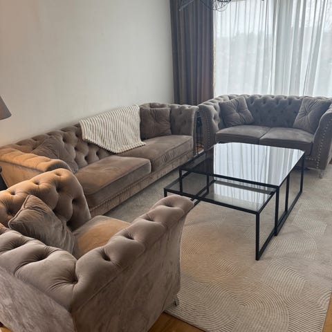 Jag vill sälja vår soffa som består av en fåtölj, en tvåsits och en tresits. Den är bekväm, fin och i mycket bra skick. Tyget är i sammet och jag har bytt benen till guldiga metallben, vilket ger soffan ett elegant utseende.