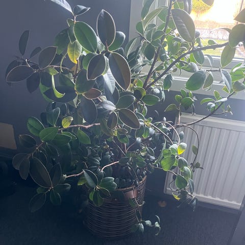 Penningträd/Paradisträd som krukväxt med gröna, tjocka blad. Växten står i en flätad ytterkruka och är cirka 55 cm hög, mätt från krukans botten till växtens topp. Passar som inomhusväxt i fönster eller på bord där den får ljus. Kräver måttlig vattning och trivs i normal rumstemperatur.