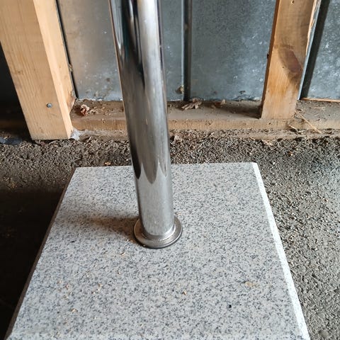 Rund parasollfot i betong med metallrör för montering av parasoll. Fotens konstruktion ger stabilitet för parasoll på uteplats, balkong eller trädgård. Passar parasollstänger av standardstorlek som kan spännas fast med justerbar klämma upptill på röret.