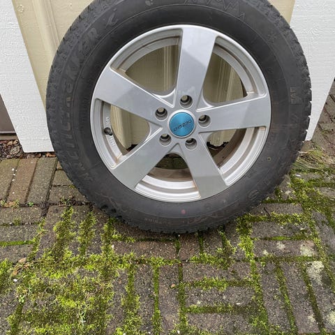 Är från början en Seat-fälg. Nu sitter VW centrumkåpor på, kan bytas. Satt senast på en T-Roc. ET-måttet behöver inte vara exakt. Tillåts variera en del. Däckfabrikat Continental Ice Contact 2.