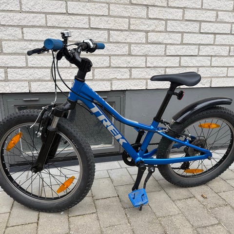Trek barncykel med 20" hjul i svart/grön färg. Cykeln har låg ram anpassad för barn och sadel som kan höjdjusteras. Utrustad med 8 växlar, handbromsar, reflexer på hjul, fram och bak samt stöd. Passar för barn som behöver en stabil cykel för vardagscykling och fritidsbruk.