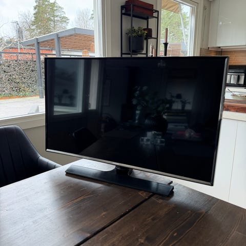 Samsung tv med platt skärm. Passar för användning i vardagsrum, sovrum eller som extra skärm. Levereras med bordsstativ enligt bild. Exakta mått och modellbeteckning är inte angivna.