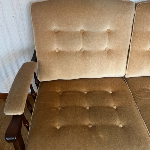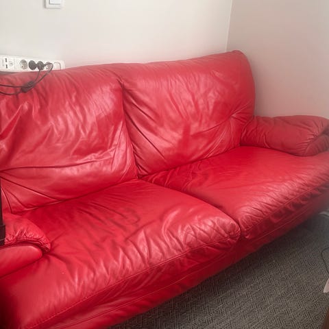 Soffa med träram och röd tygklädsel. Utdragslåda. 160 x 95 x 70 cm. Ryggen och sitsen är stoppade och klädda i rött tyg, medan underrede och sidor är i trä. Passar som sittmöbel i vardagsrum, hall eller gästrum.