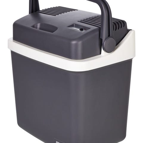 kylbox för 12V-uttag. Kylboxen är grå med vit insida och lock. Utrustad med inbyggd kylmodul i locket och anslutningskabel för cigarettuttag i bil. Praktiskt bärhandtag på sidorna. Passar för kylförvaring av mat och dryck i bil, husbil eller båt.