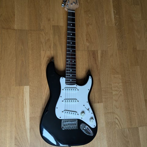 Squier Stratocaster elgitarr i svart utförande. Gitarren har klassisk Stratocaster-kropp med vit plektrumskydd och tre single-coil-mikrofoner. Hals och greppbräda är i ljust trä med 21 band och justerbar dragstång. Gitarren har standard tremolosystem, volym- och tonkontroller samt 5-lägesswitch för mikrofonval. Passar för elgitarrspel inom flera musikstilar. Har lite dam mellan glipor annars är den helt som ny.