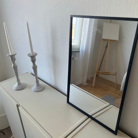 Säljer en stor rund spegel med svart träram och dekorativt rutmönster (grid). En stilren spegel som passar perfekt i vardagsrum, hall eller ovanför byrå/soffa.