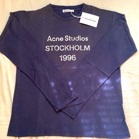Acne Studios långärmad t-shirt för herr i storlek M. Tröjan är svart och tillverkad i bomull. Modellen har rund halsringning och tryck med texten "Acne Studios Stockholm 1996" på framsidan. Passar som vardagströja eller under en jacka eller skjorta.