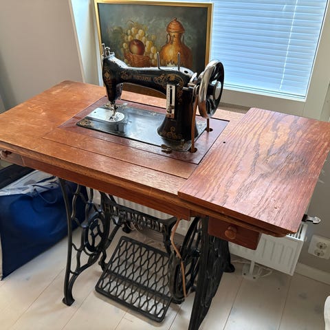 Husqvarna trampmaskin symaskin monterad i träbord. Mekanisk symaskin med trampdrift och gjutjärnsunderrede. Maskinen är infälld i ett bord med arbetsyta i trä och metallstativ med fotpedal och remdrift. Passar för den som behöver en äldre, mekanisk symaskin eller som inredningsdetalj.