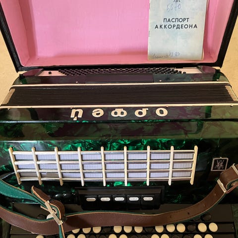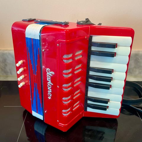 Accordion dragspel i mindre storlek. Hölje i grön marmorerad plast med blå och vit bälg samt guldfärgade knappar. Instrumentet har flera spelknappar på ovansidan och luftventiler undertill. Passar som enkelt musikinstrument eller leksaksdragspel för nybörjare eller barn.