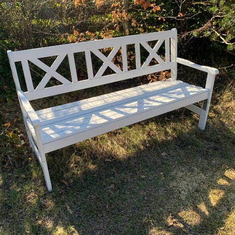 Utesoffa av god kvalitet då den har varit med sedan 60-talet. Kärnvirke. Behöver målas men kan hålla länge till.