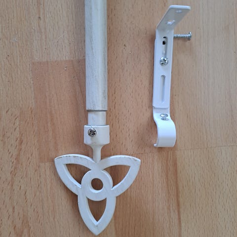 Gardinstång (målad trä )180 cm med ändknoppar och väggfästen i metall. Ringar och fingerkrokar.