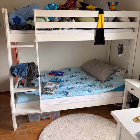 Familjesäng Winga Noelle i vitlackat trä, inköpt från Sängvaruhuset.se i juli 2023 . Sängen har en nedre bredare bädd 120x200 cm och en övre smalare bädd 80x200 cm, nås via stege på sidan. Under den nedre bädden finns två utdragbara lådor för förvaring av till exempel sängkläder eller leksaker. Passar i sovrum eller barnrum där man vill kombinera flera sovplatser med förvaringsmöjligheter. Inköpspris strax över 15.000 SEK med alla tillbehör, säljes nu för 5.000 SEK eller högstbjudande.