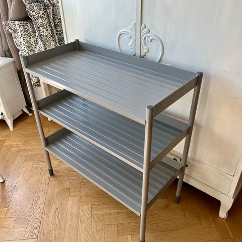 Mörkgrön metallhylla från IKEA med måtten 92x35x92 i mycket bra skick. Ett av hyllplanen har en träyta som går att montera av.