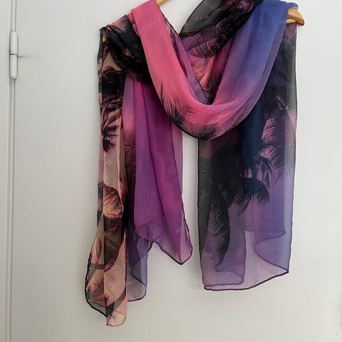 Jättesnygg svart trekantig sjal med mönster av körsbär och röda pom-poms längs kanterna. I toppskick. Rockabilly. 50-tal. 150 cm bred och 75 cm lång på längsta stället.