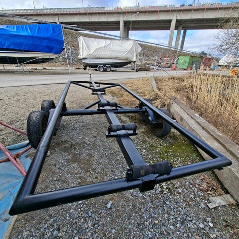 Båtvagn för transport av mindre båt. Vagnen är tillverkad i galvaniserat stål med flera kölrullar och sidostöd för att underlätta upptagning och sjösättning. Utrustad med vinsch framtill för att dra upp båten på vagnen.
