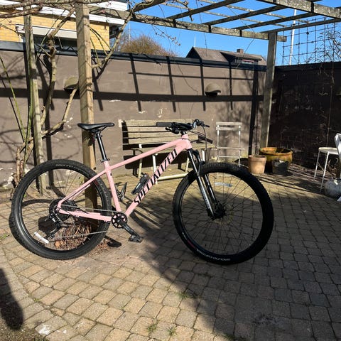 Specialized Rockhopper är en hardtail-mountainbike med 29-tumshjul och ramstorlek M. Cykeln har en lättviktsram i aluminium byggd för att hålla vikten nere och stabiliteten uppe. Grovmönstrade däck för terrängkörning.