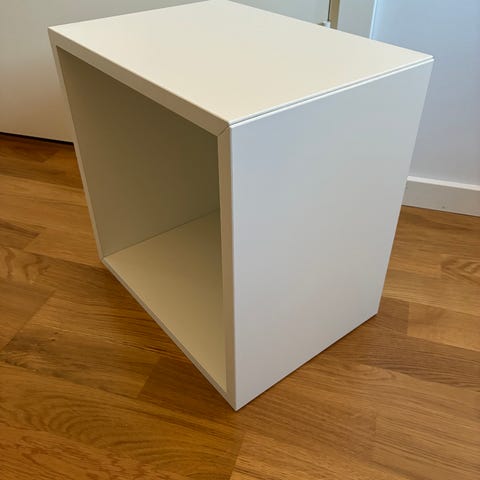 Hylla, låda, för vägg eller golv. Vit i trä. Fästen för upphängning på vägg finns för både lodrät och vågrät upphängning. Den kan också användas stående på golv till exempel som sängbord eller förvaringslåda. Den är ny och oanvänd men har stått förvarad och har fått några svaga märken och minismå nagg på ett par ställen (se bild 4 och 5) övrigt i mycket fint skick. Mått om stående höjd 46cm, bredd 34,5cm, djup utvändigt 28cm, invändigt ca 27,5cm.